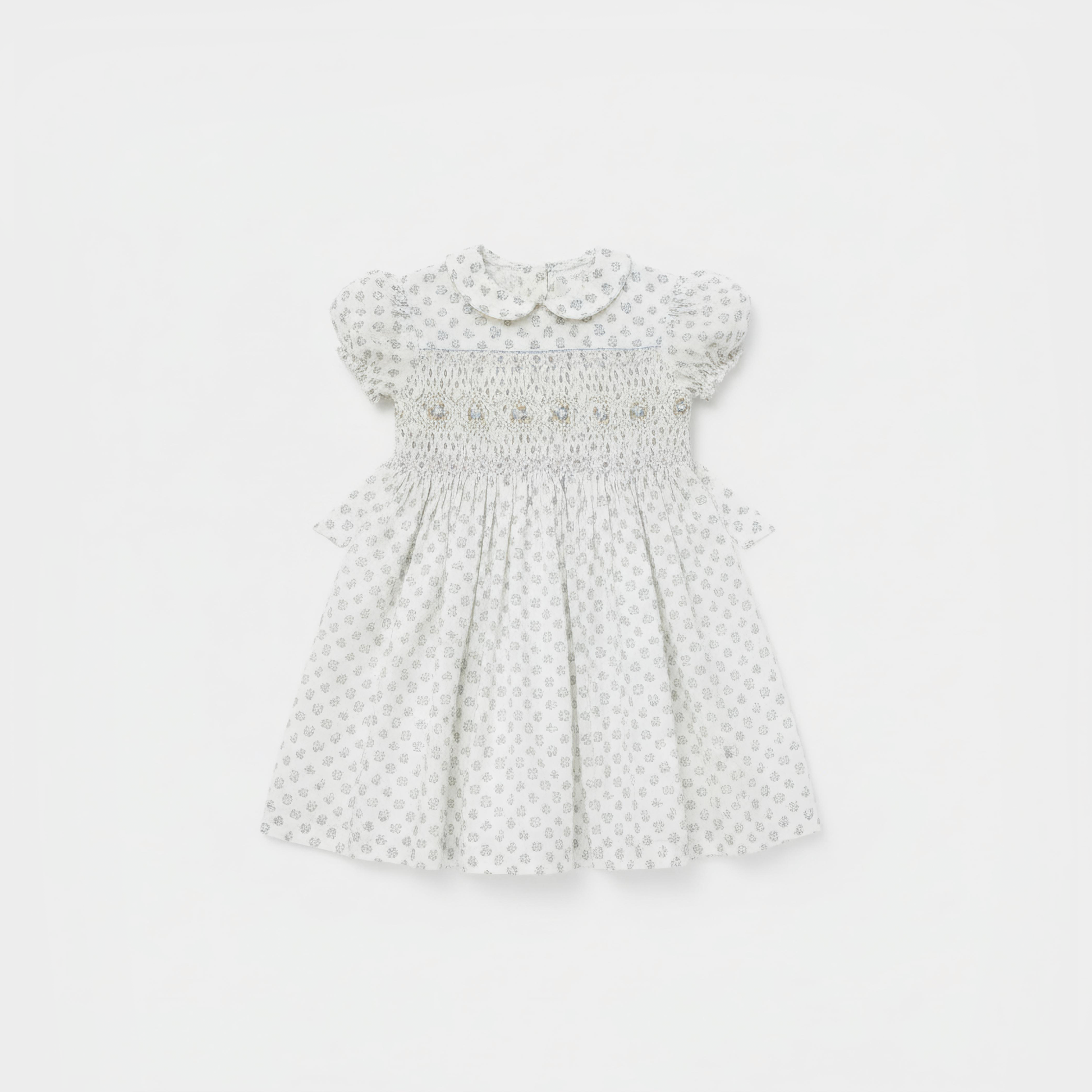 A delicate ode to countryside charm, this hand-smocked dress is crafted from pure soft cotton with petite floral prints in blush and blue tones. The intricate embroidery across the bodice and puffed sleeves add a timeless heirloom touch, while the scalloped Peter Pan collar completes its vintage-inspired grace. Perfect for sunny strolls, special occasions, or simply capturing those quiet, magical moments of childhood.