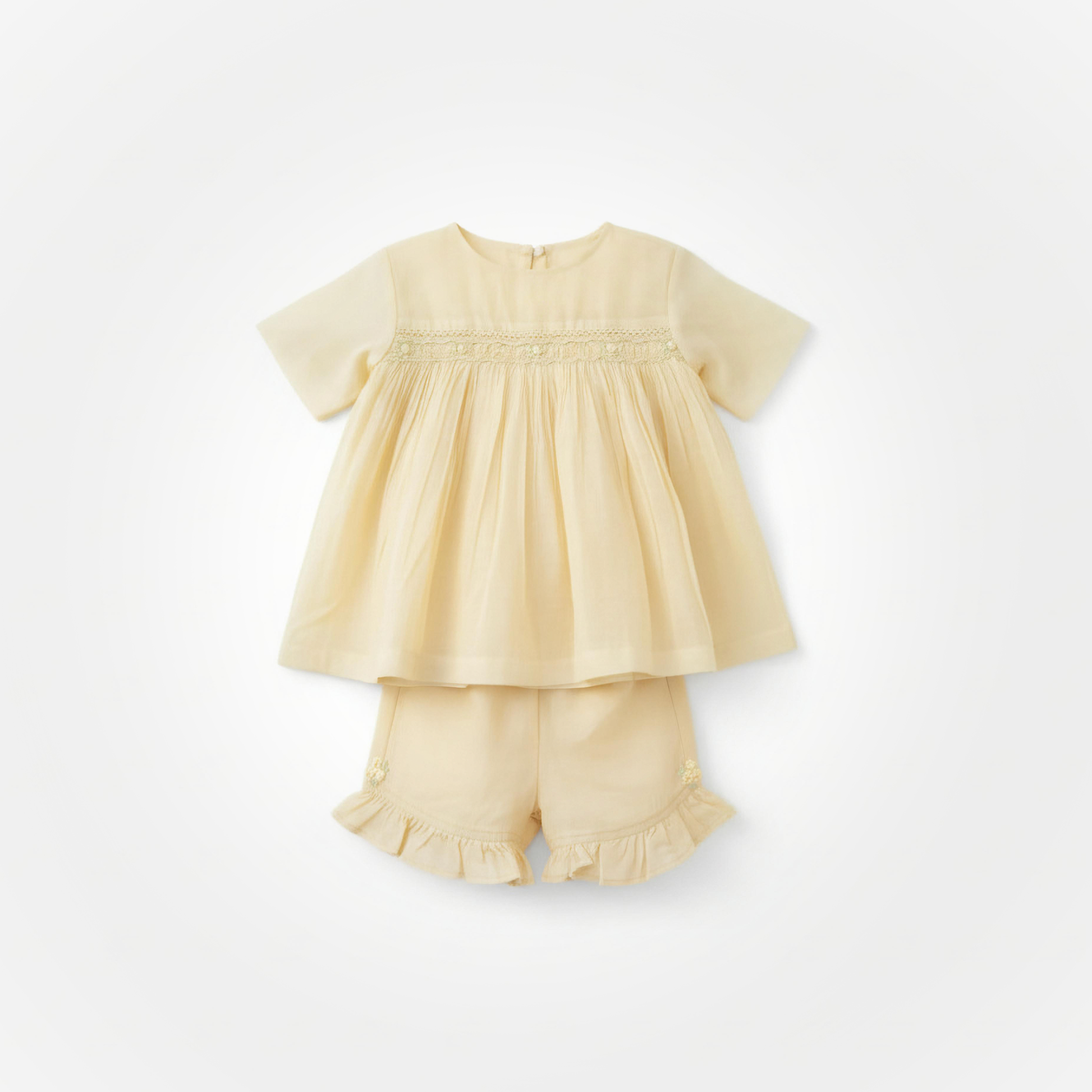 A radiant cotton silk top in buttery yellow, with hand-smocked detailing a half sleeves and shorts.