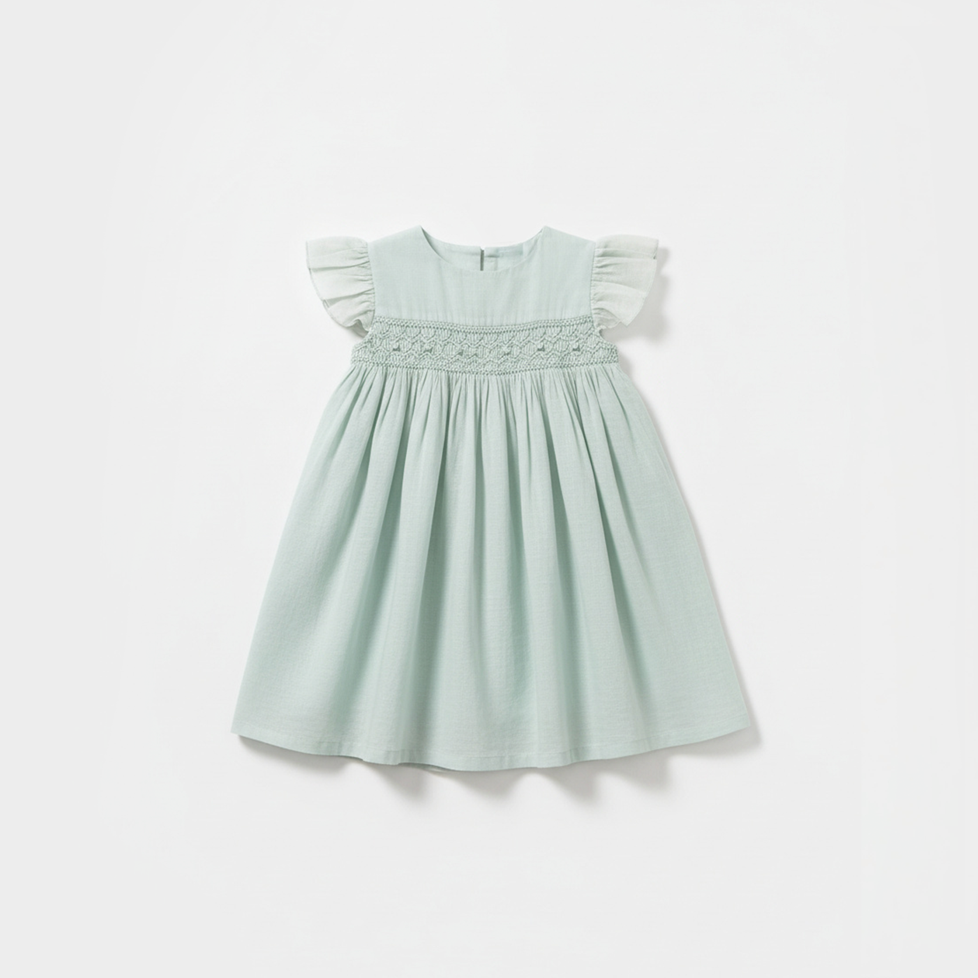 Crafted from lightweight silk cotton fabric, this airy mint-hued dress is hand-smocked with delicate floral embroidery across the bodice. The flutter sleeves and gentle gathers create a soft, graceful silhouette that moves beautifully with every twirl. Designed for comfort and charm, it’s perfect for sunny days, family gatherings, and all the sweet in-between moments of childhood.